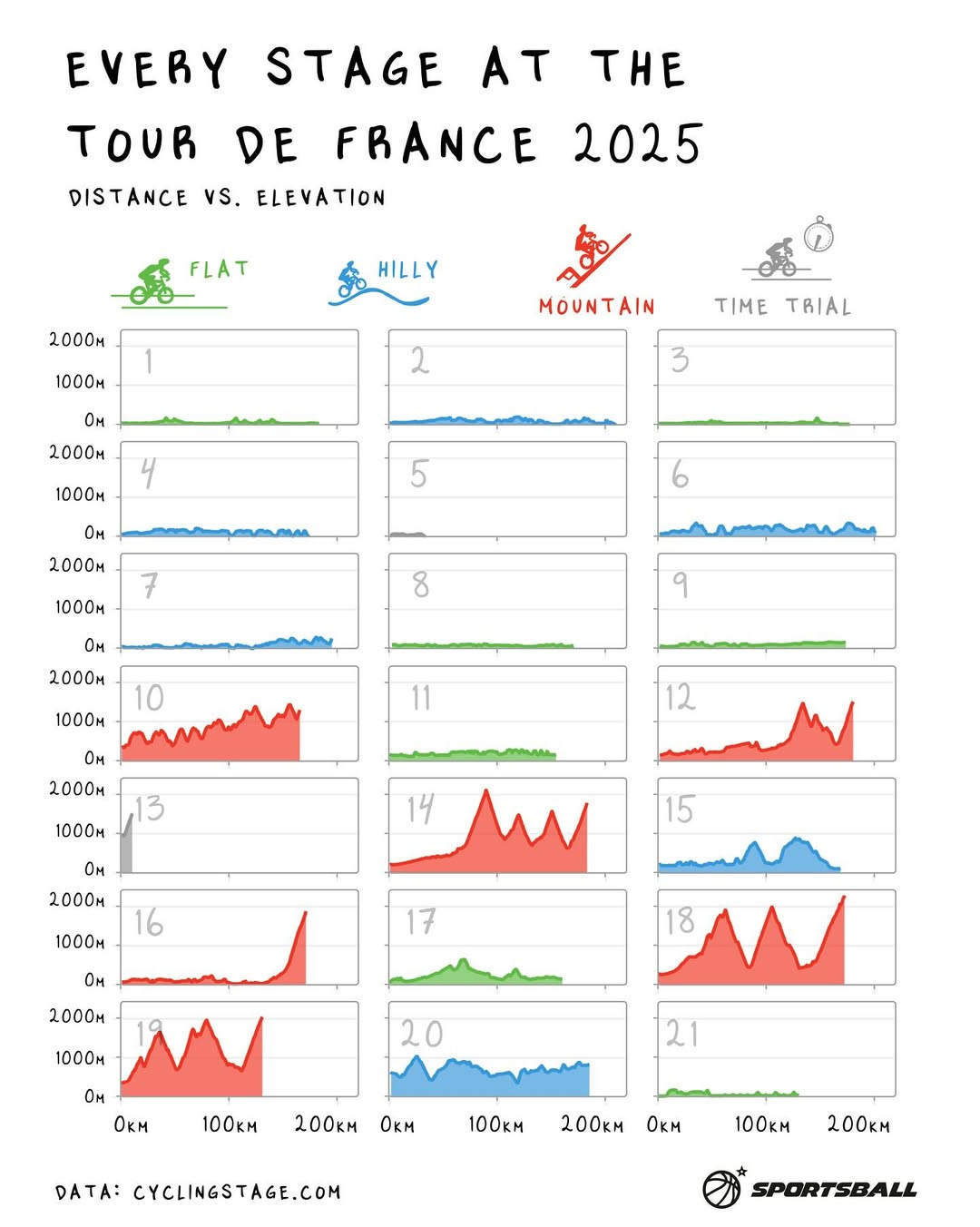 Esta semana llegó a su fin el Tour de France 2025, donde Tadej Pogacar lo conquistó. Para lograrlo, tuvo que liderar el Tour a largo de 21 etapas, las cuales algunas son planas, otras están llenas de colinas, otras tienen montañas brutales que suben hasta los 2,000 metros, y hay también contrarrelojes, esas etapas individuales donde cada ciclista se mide en solitario contra el reloj. Aquí una mejor ilustración: